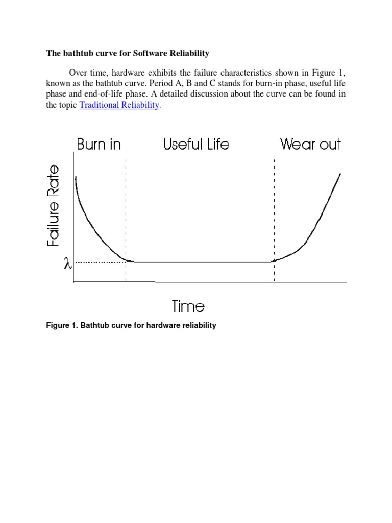 An infant mortality period with a decreasing failure rate followed by a normal life period (also known as note that the bathtub curve is typically used as a visual model to illustrate the three key periods of product failure and not calibrated to depict a graph of. The reliability bathtub curve (rbtc) is discussed in section 4.4.3, and a relatively elementary method for its construction is presented there. Reliability is measured in fits, which stands for failures in time. Software reliability is hard to achieve, because the complexity of software tends to be high. This data helps manufacturers predict the second part of the curve are failures that occur within the normal functioning period or lifespan of the device.